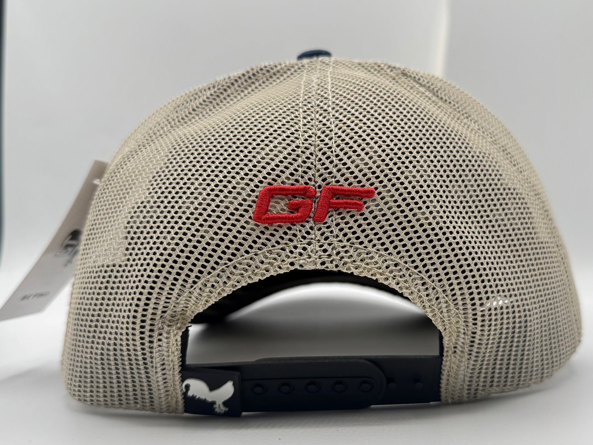 blue suede beige mesh leather patch and its rooster embroidered. 3-D embroidery of GF on the rear of hat. Silk liner with Gallo fino branding