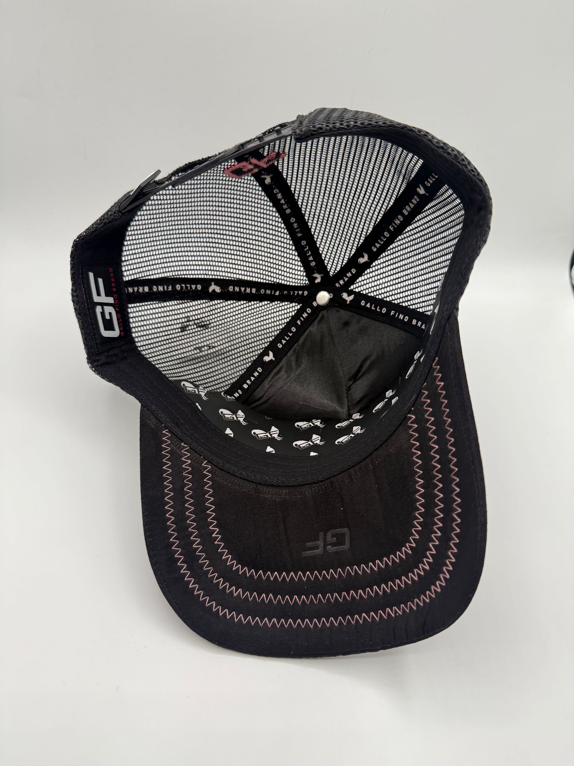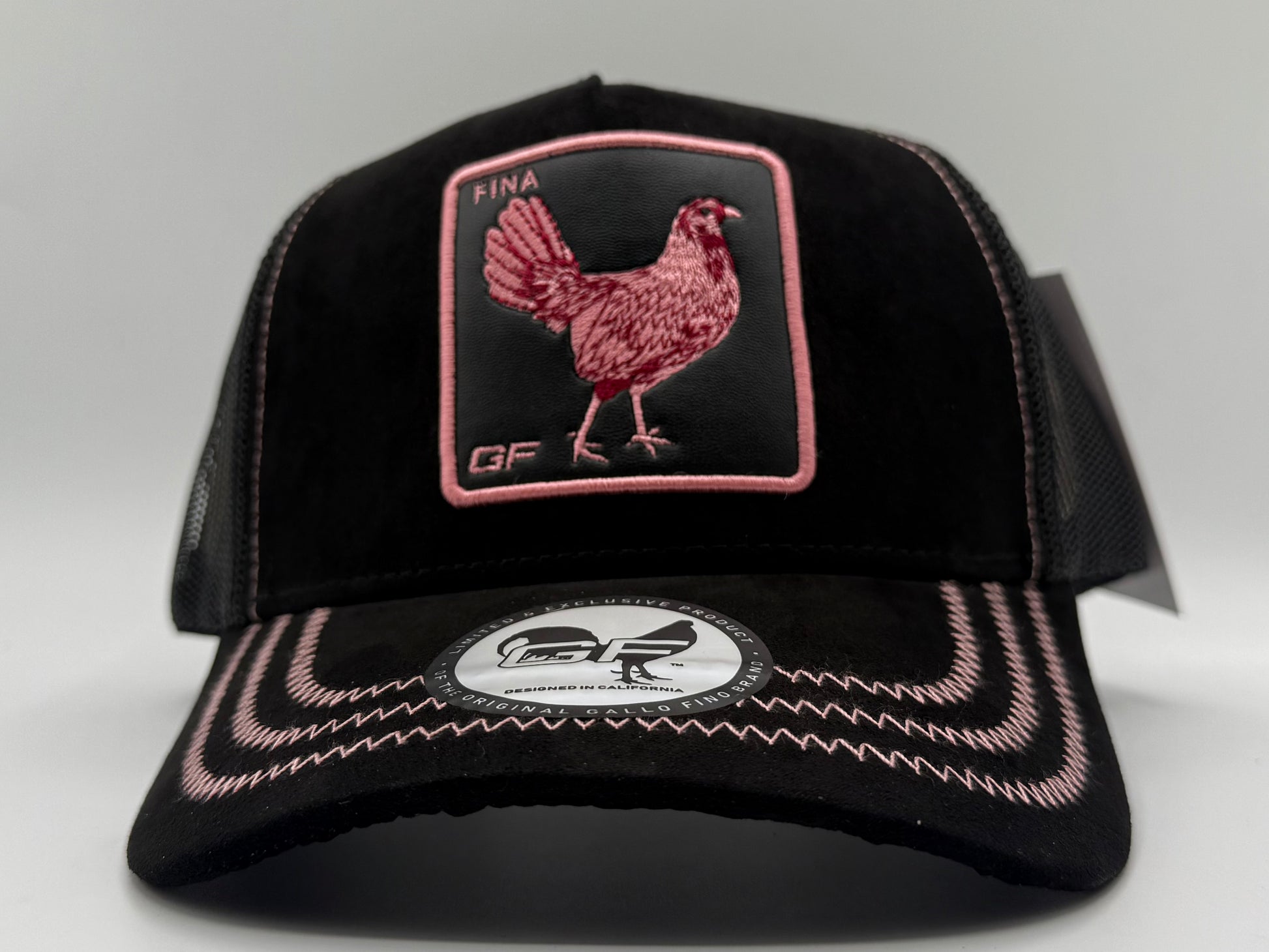 black suede with pink stitching. Black leather patch with its chicken embroidered. 3-D embroidered GF rear of hat. Silk liner with gallo fino branding