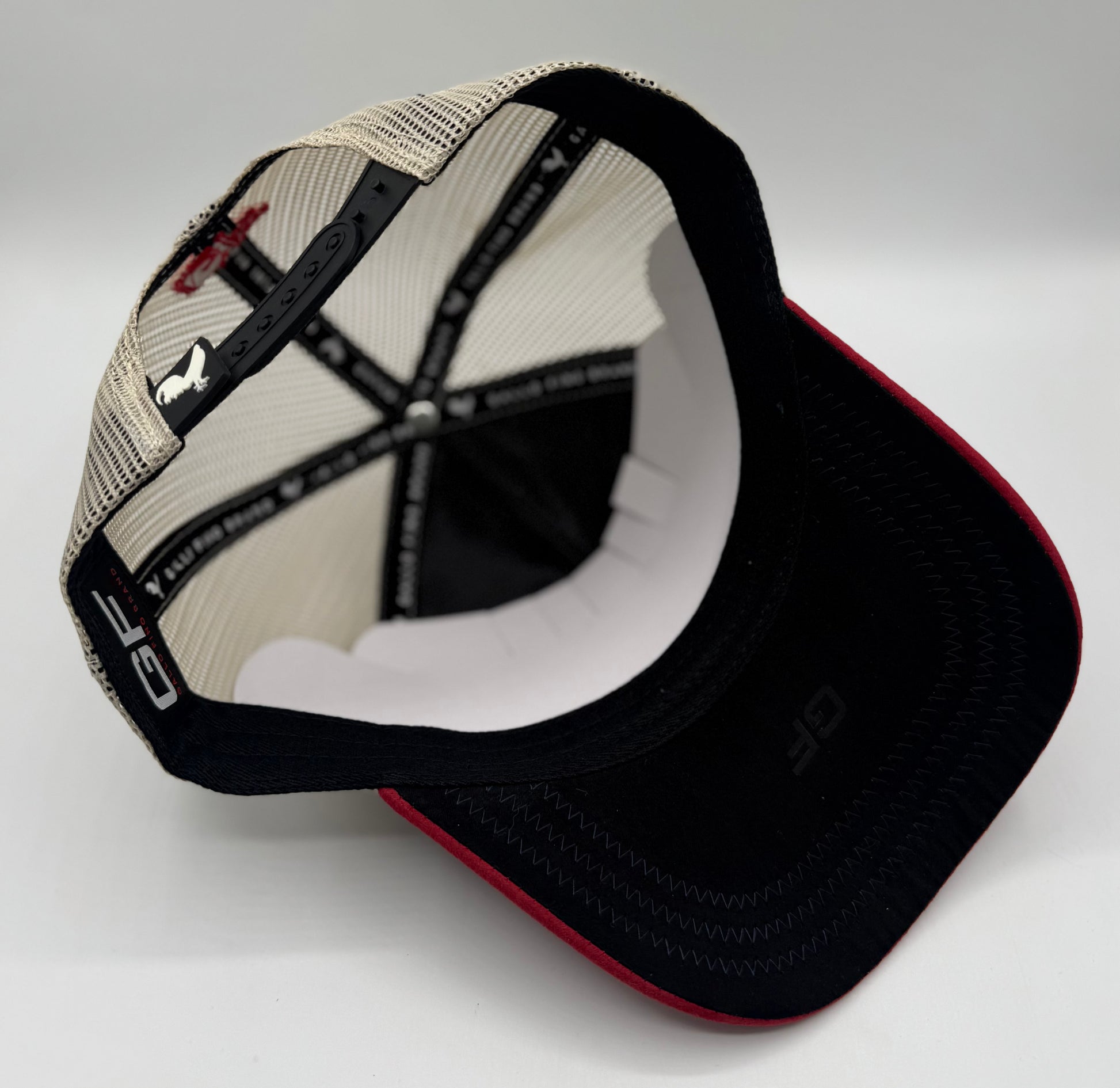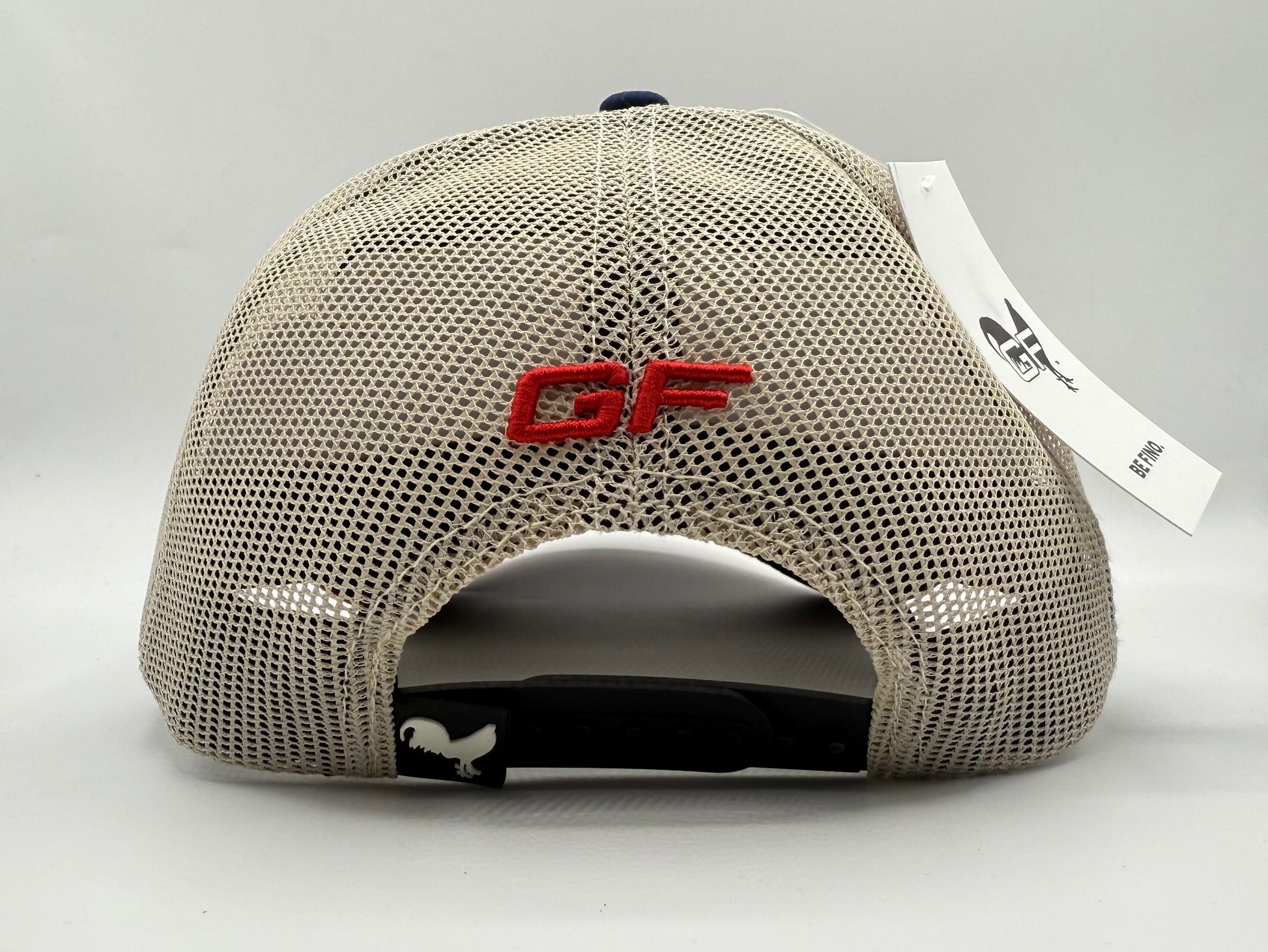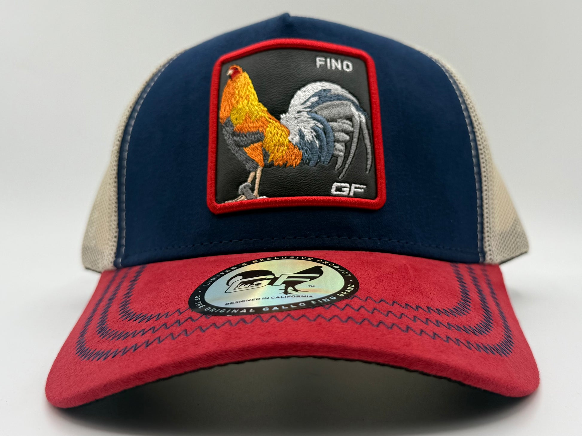 Trucker hat beige mesh , blue and red suede.Leather patch with ita rooster embroidered. GF 3-D embroidered on the rear of hat . Rubber tag with a rooster