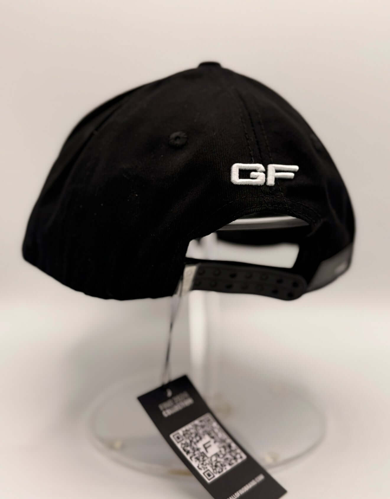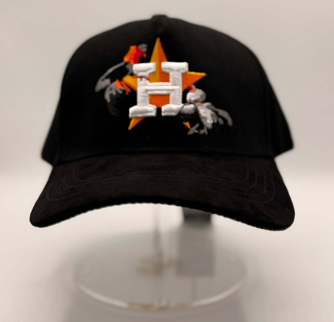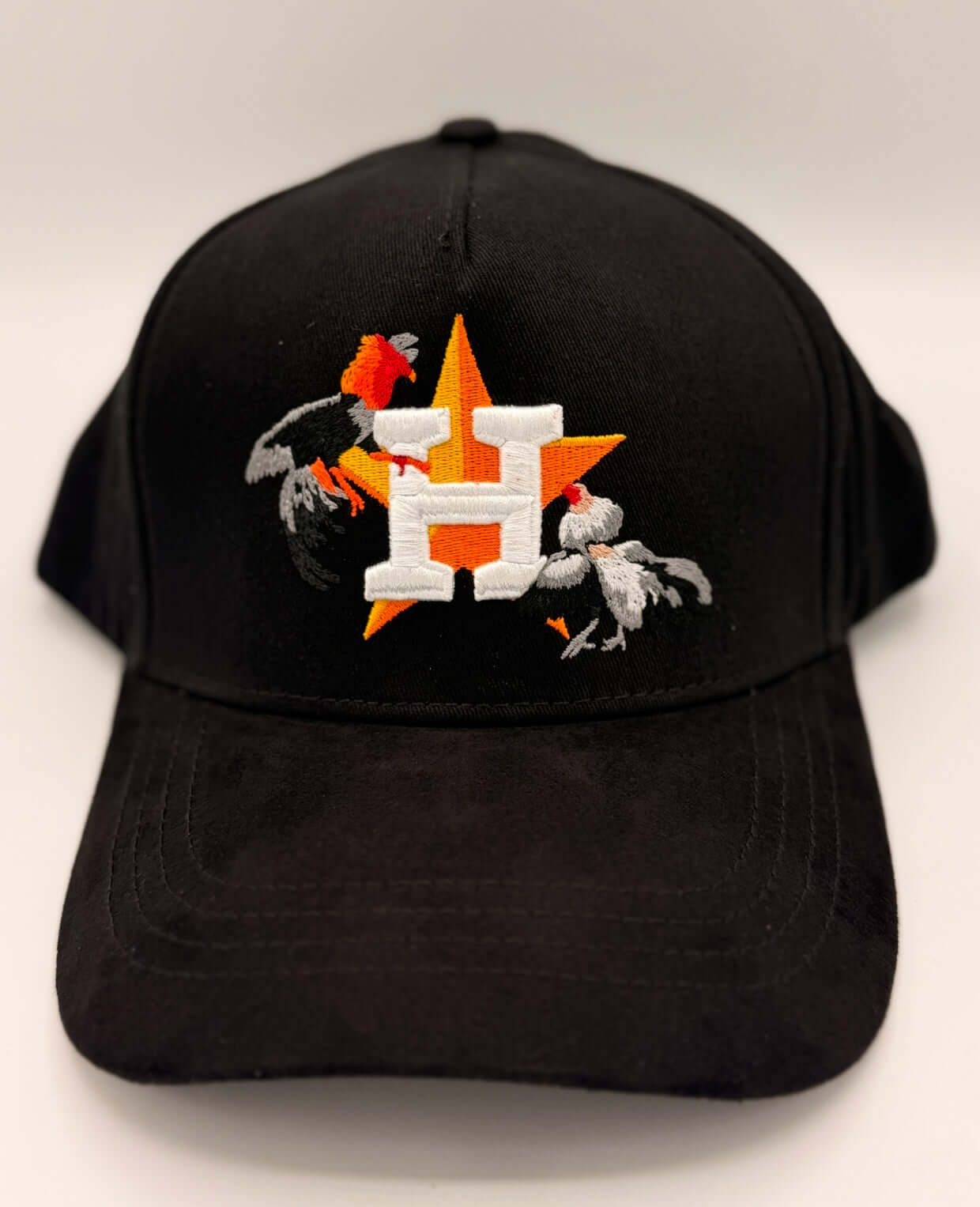 Black hat full suede and 3D embroidery of the H with rooster fighting. 3D GF embroidered on the rear of hat with silk liner and Gallo Fino branding
