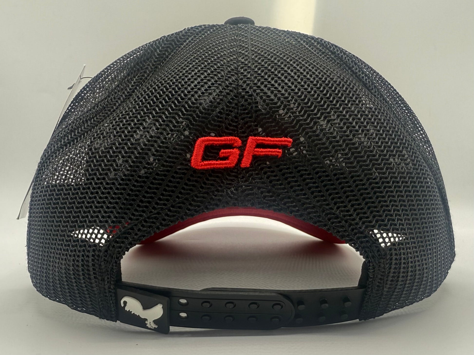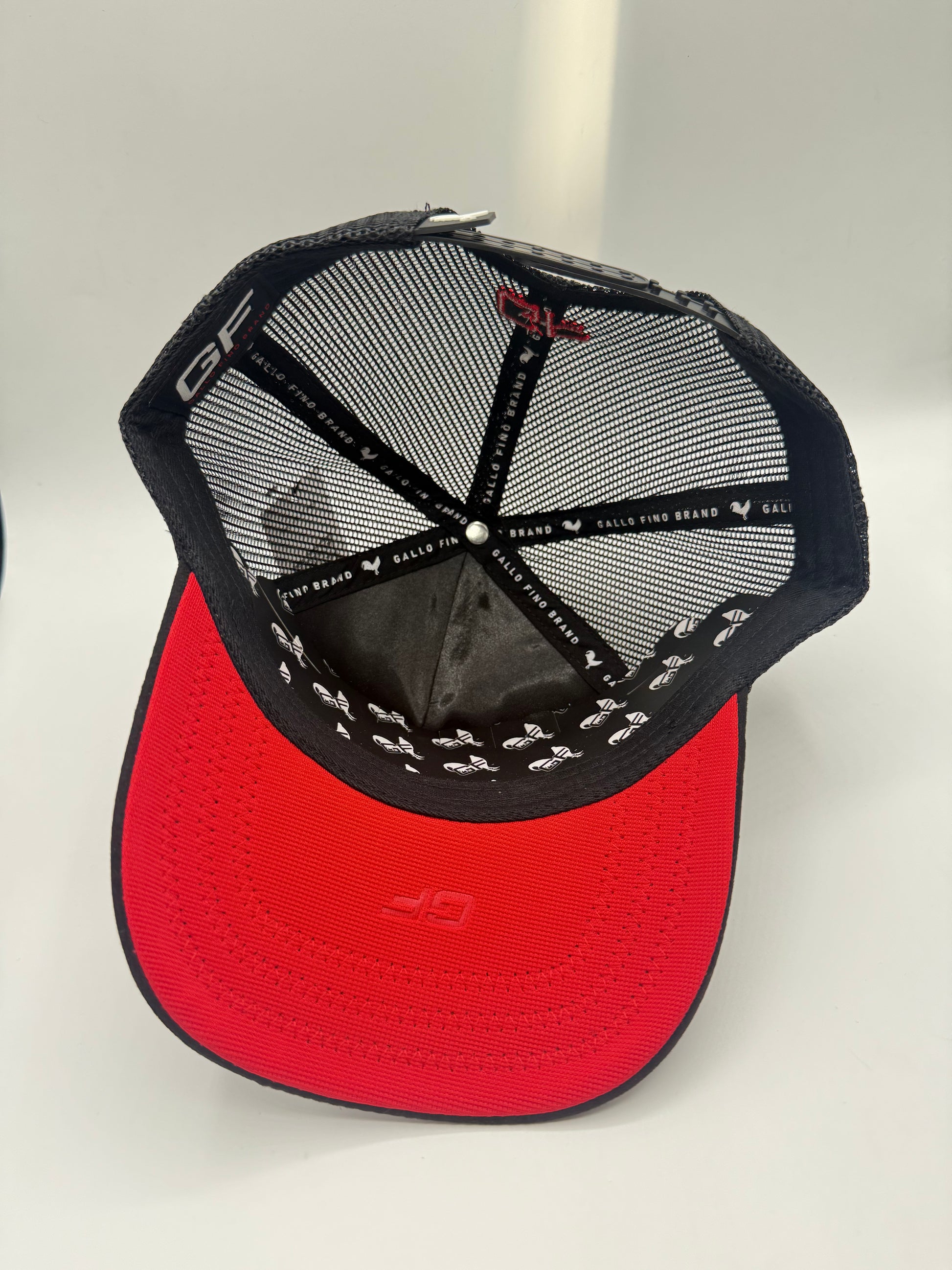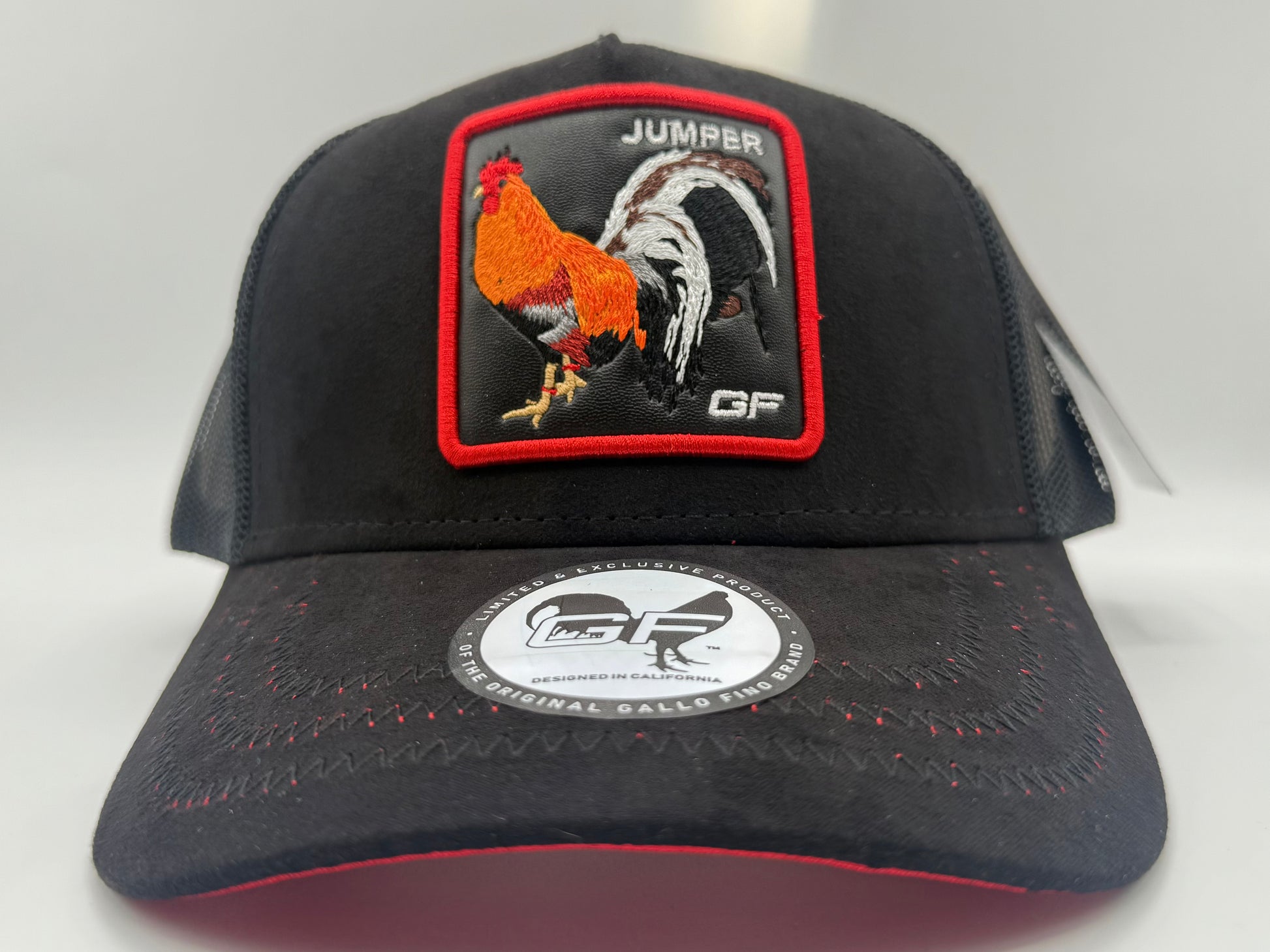 black suede/mesh with red bottom. leather patch and its rooster embroidered. 3-D embroidery of GF on the rear of hat. Silk liner with Gallo fino branding