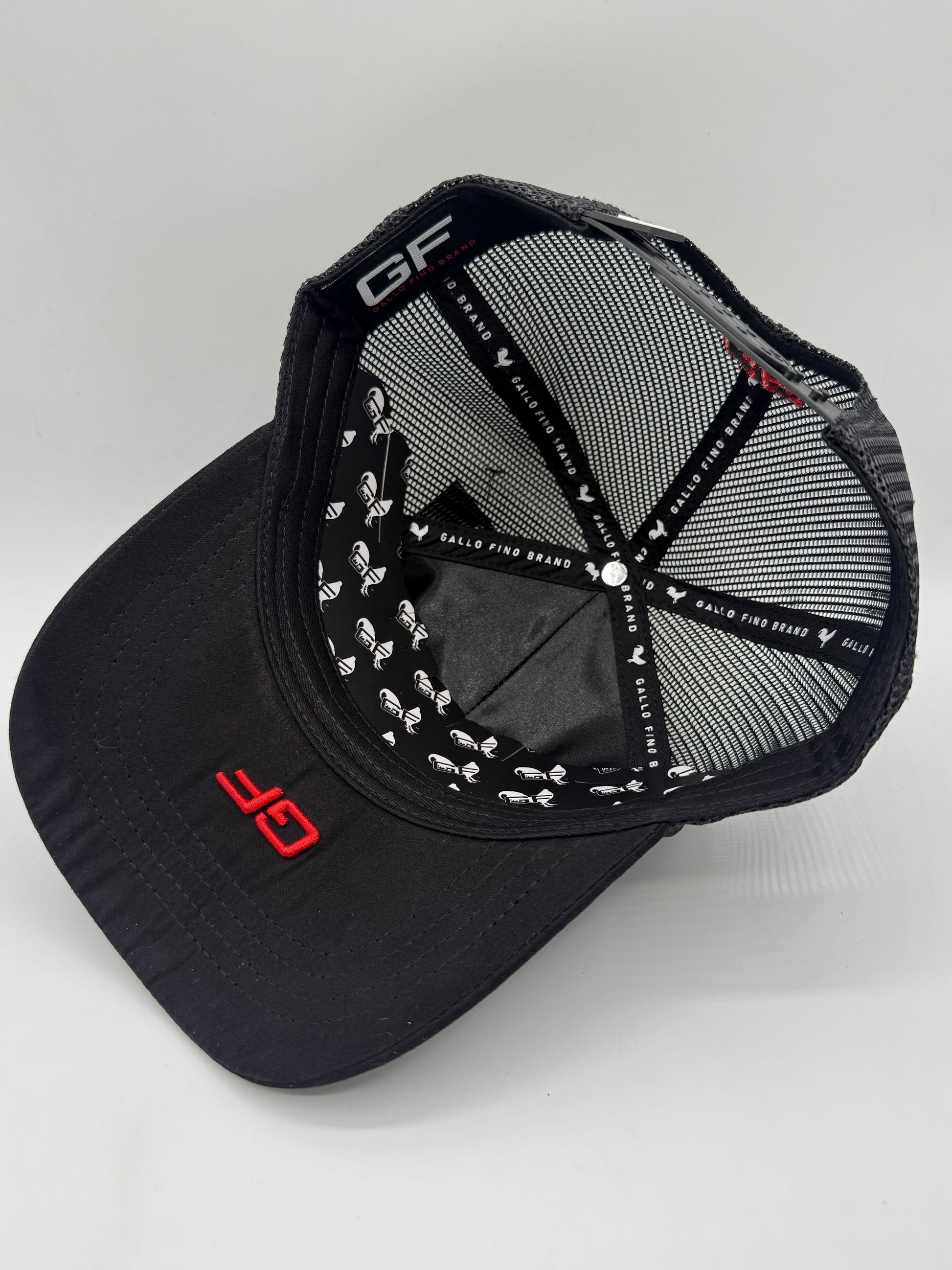 black suede with black mesh. Black leather patch with its rooster embroidered . 3-D embroidered GF rear of hat. Silk liner with gallo fino branding