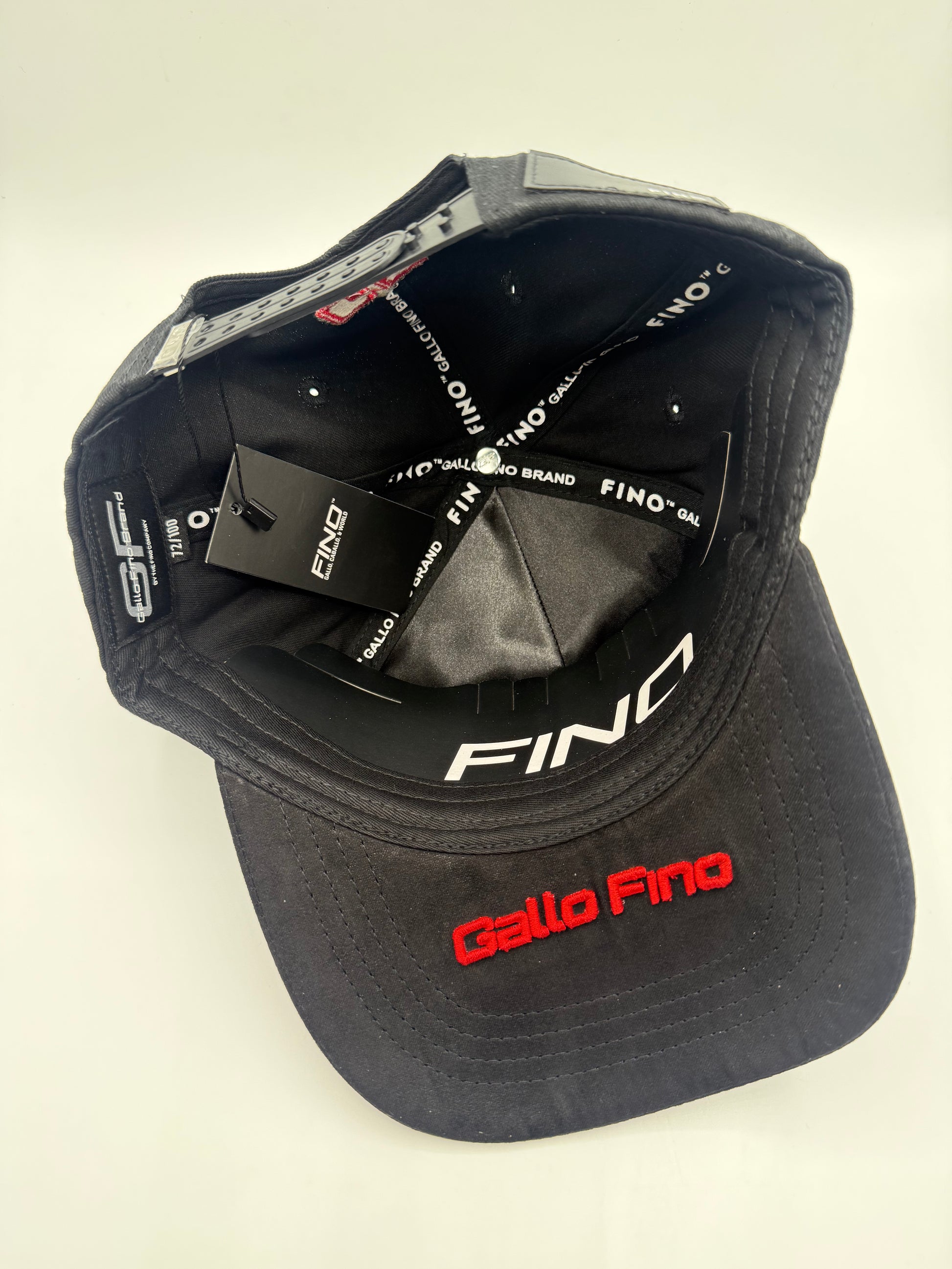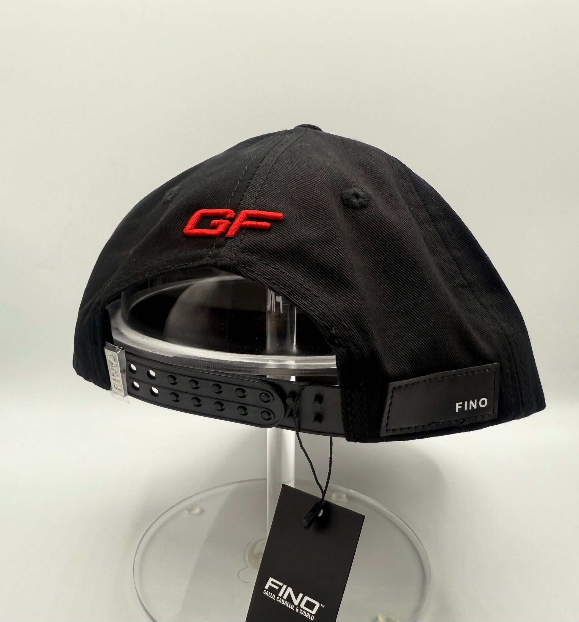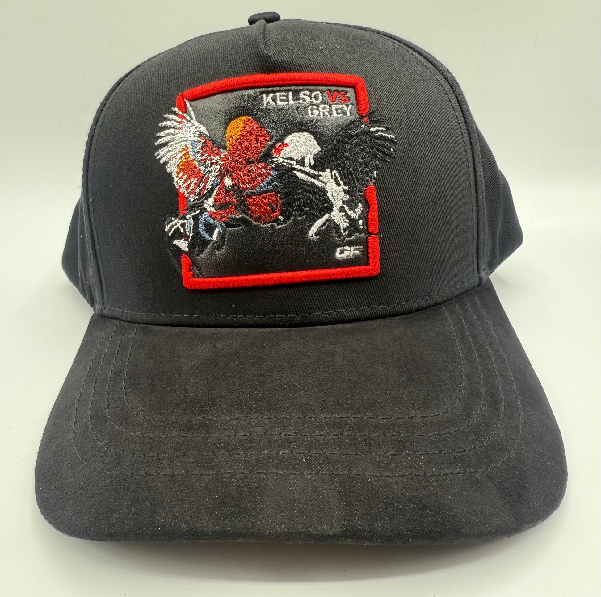 Black Hat with suede brim. leather patch with roosters fighting. rear, leather patch with fino. 3D embroidery on the rear GF. silk liner with gallo fino branding Hat#72/100