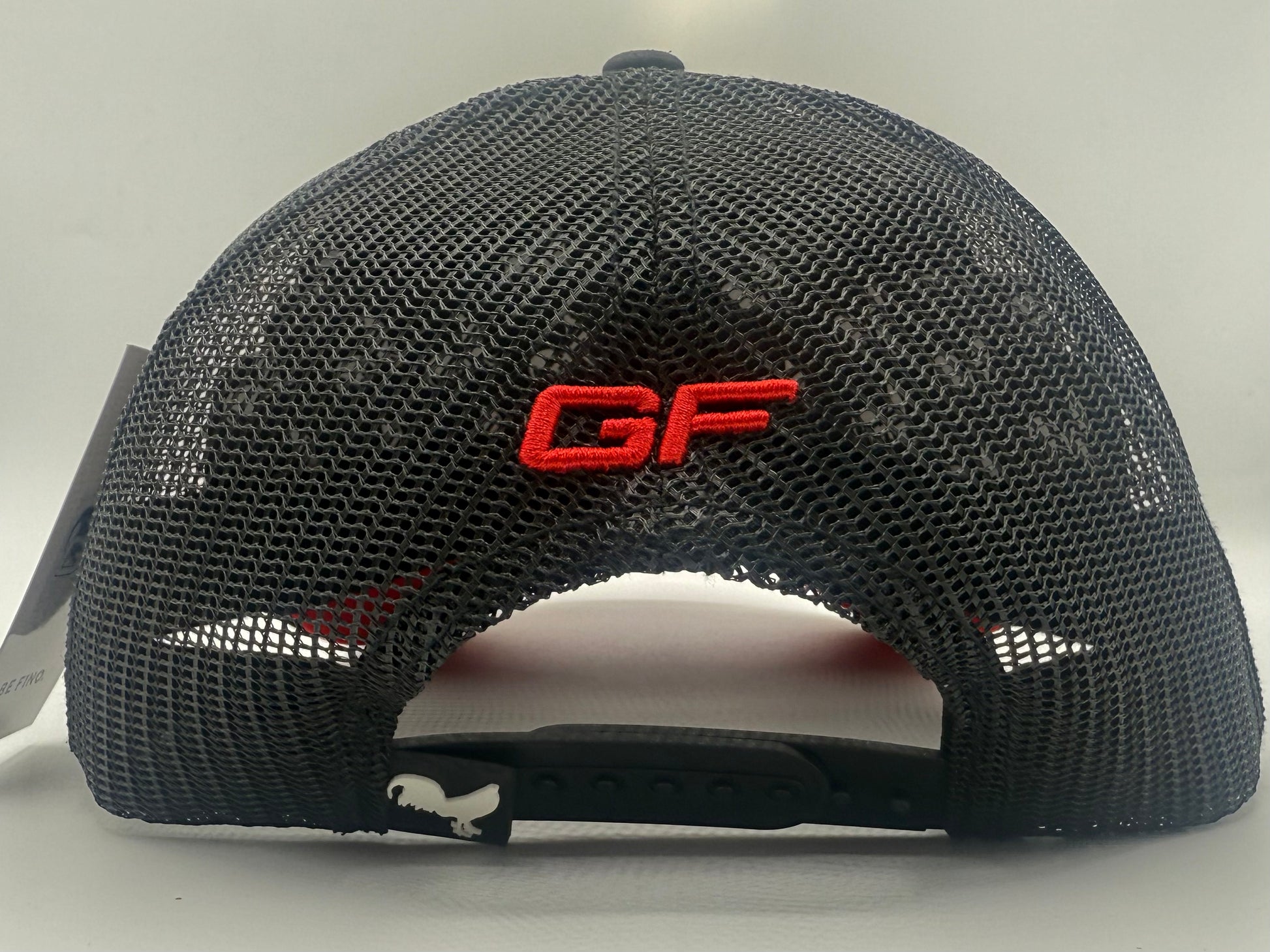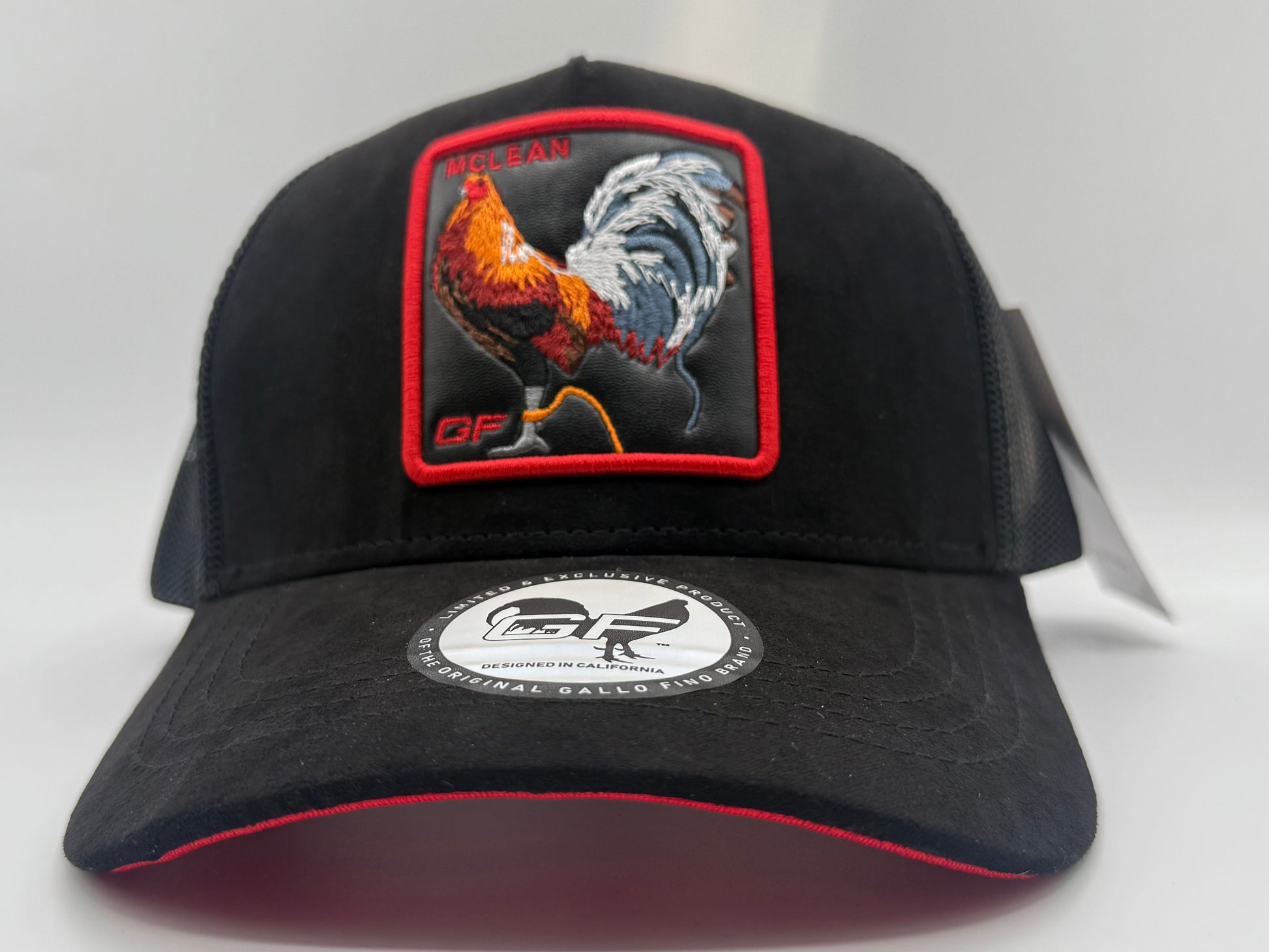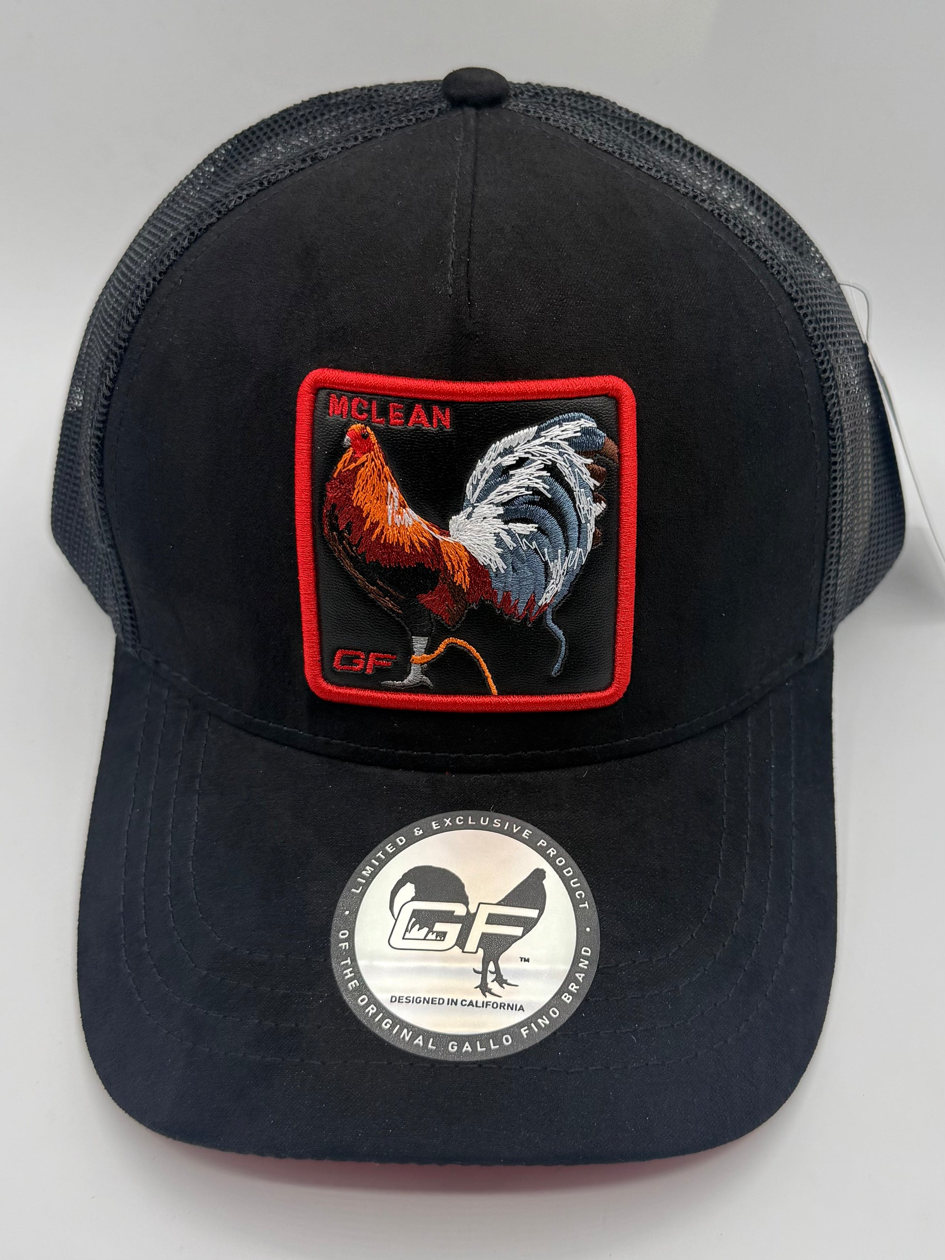 black suede/mesh hat with leather patch and its rooster embroidered. 3-D embroidery of GF on the rear of hat. Silk liner with Gallo fino branding