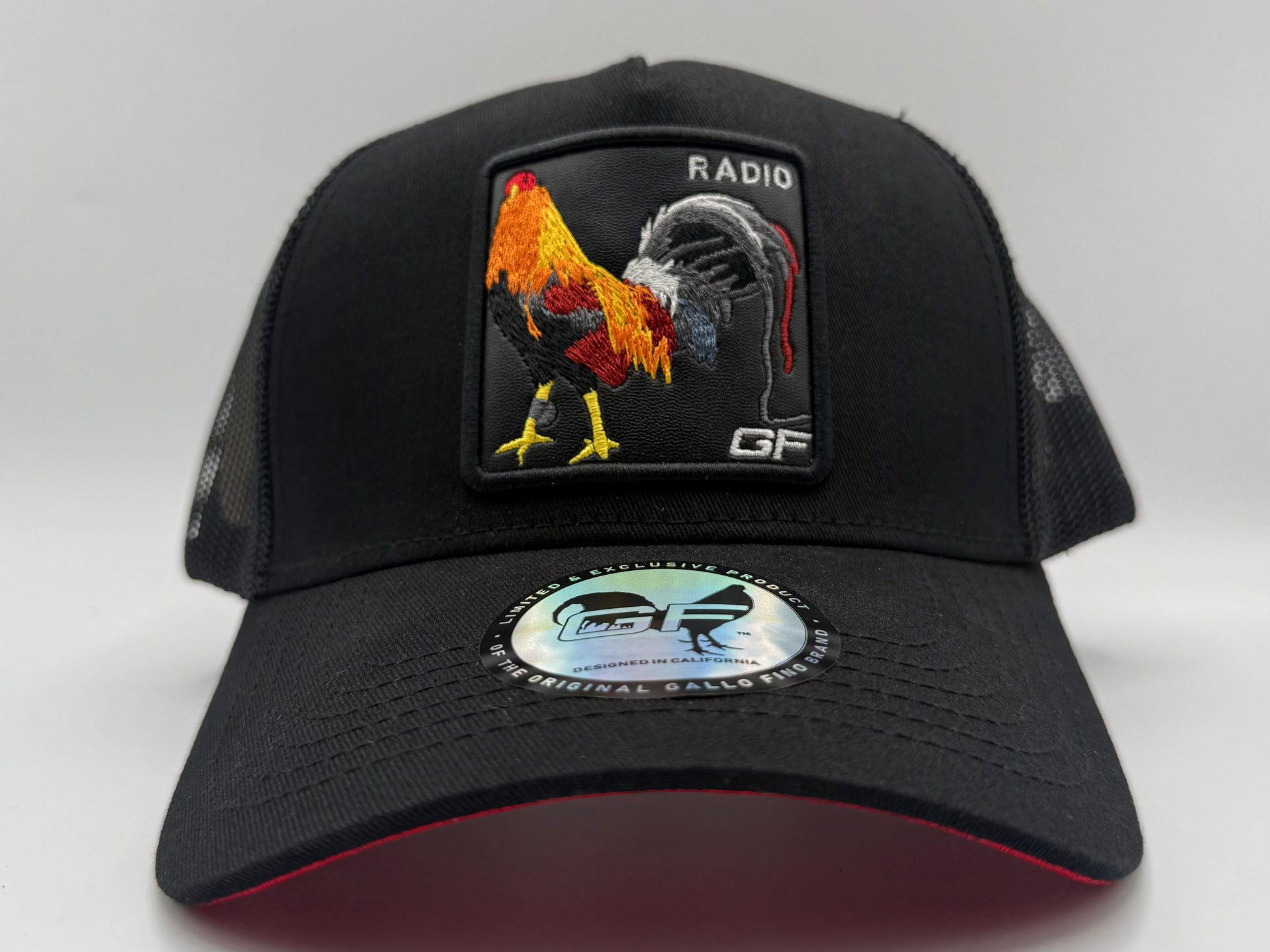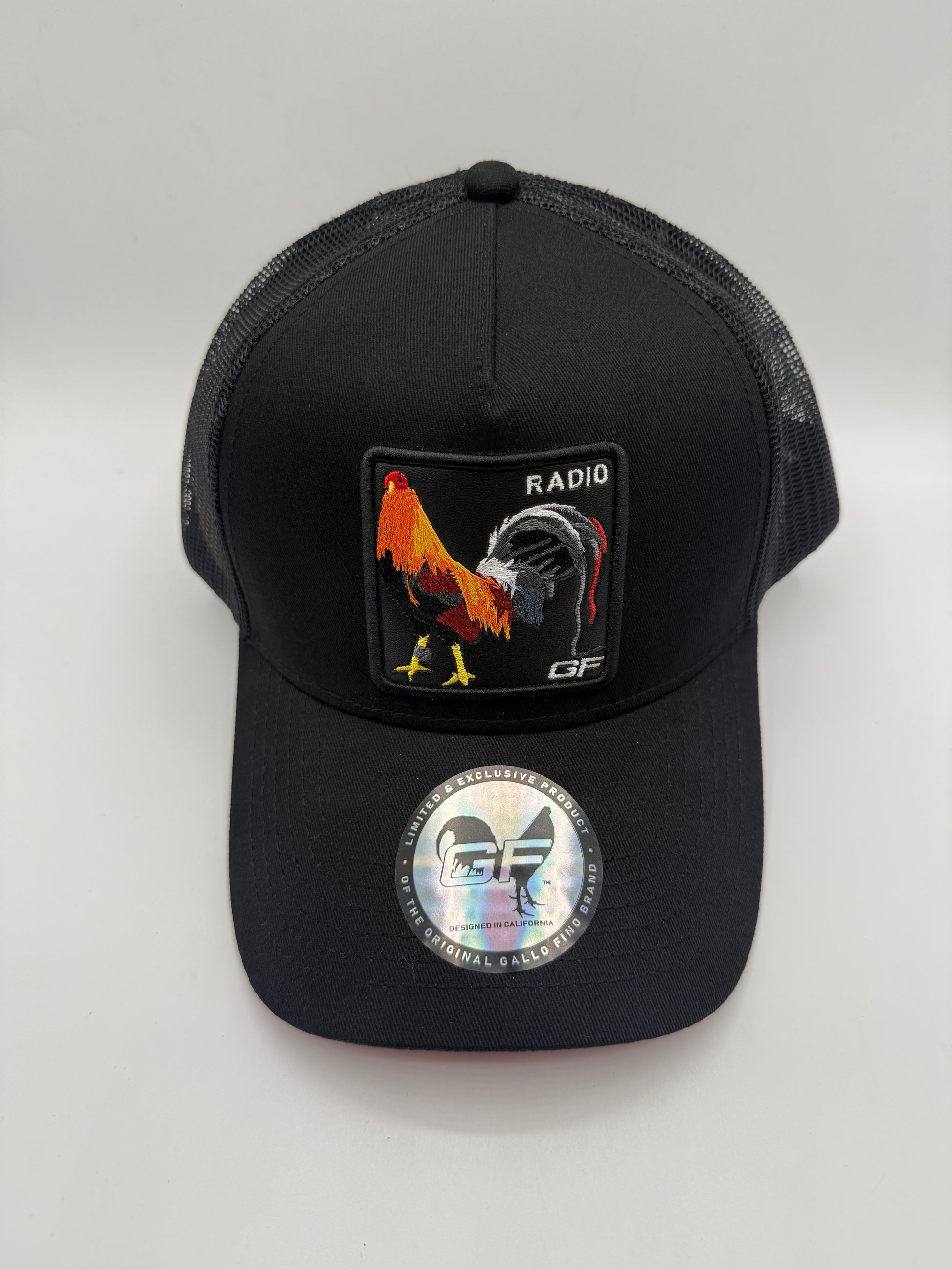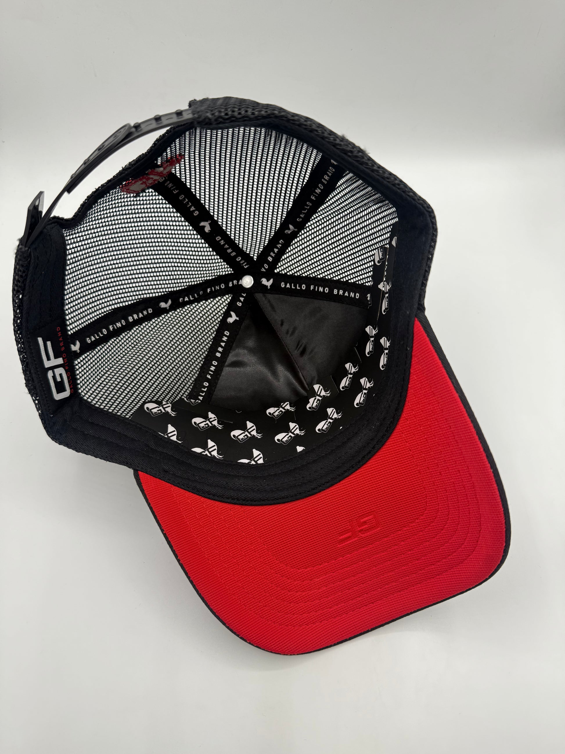 black hat black mesh . leather patch and its rooster embroidered. 3-D embroidery of GF on the rear of hat. Silk liner with Gallo fino branding