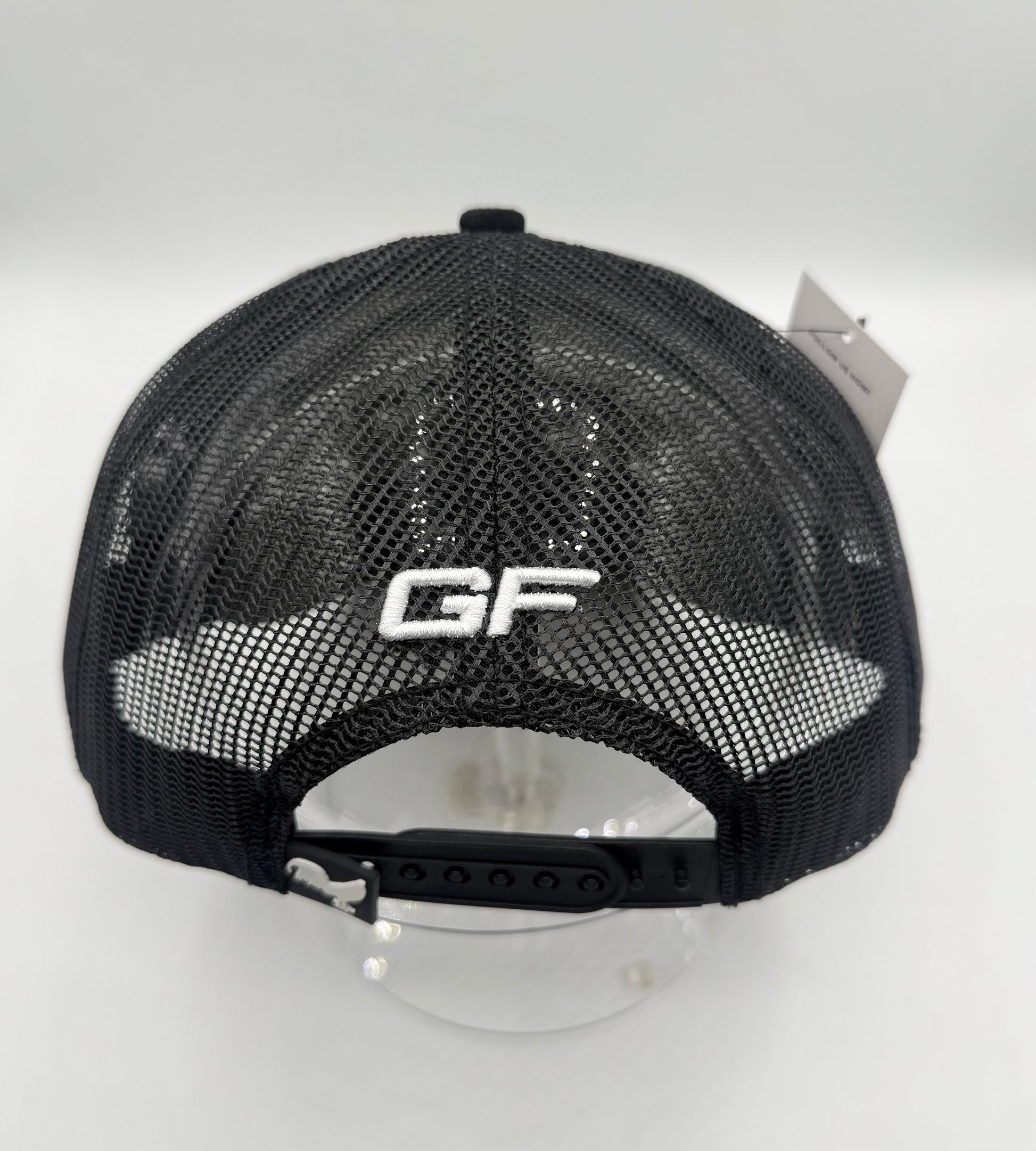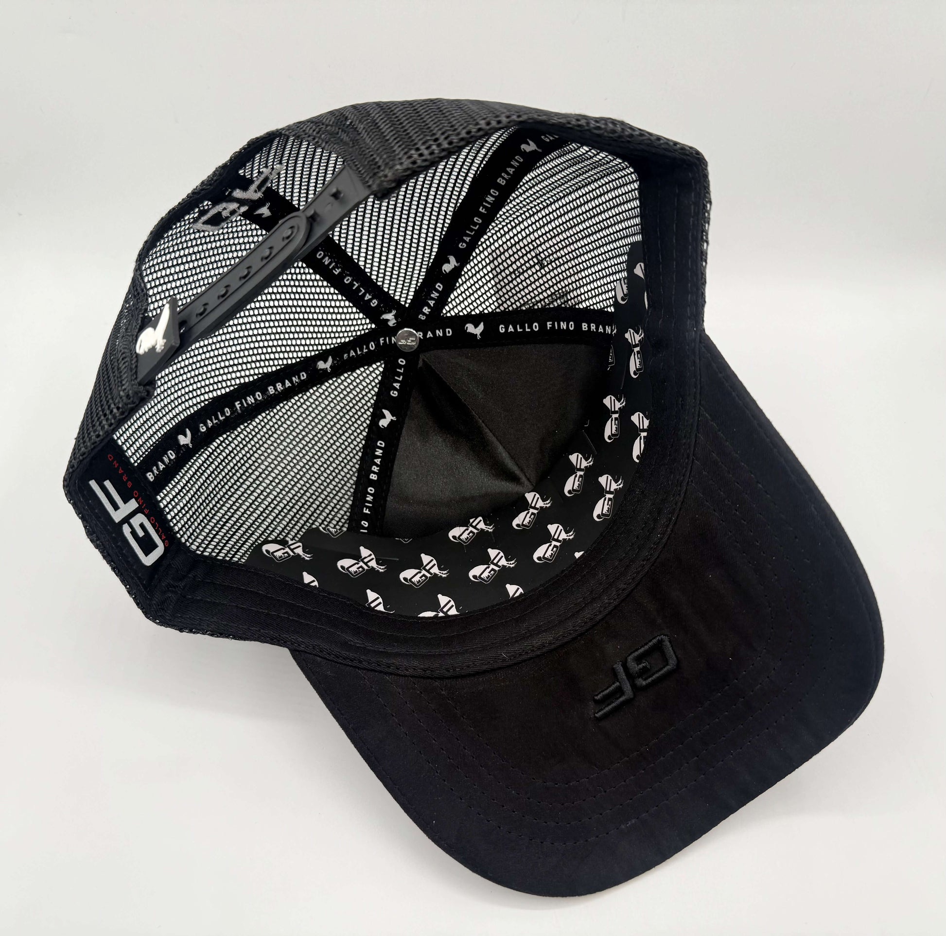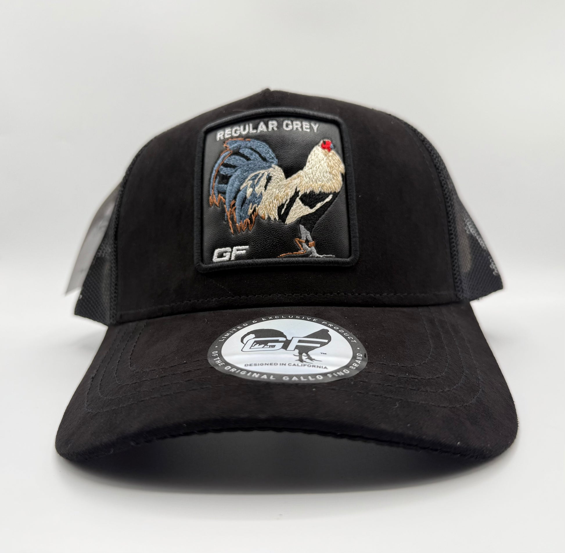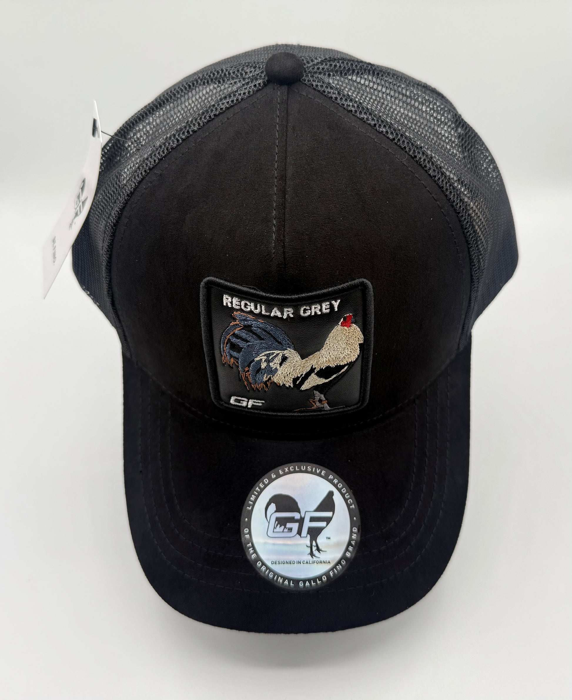 Trucker hat, black suede with black mesh. Leather patch with its rooster embroidered. 3-D embroidery of GF on the rear. Rear tag rubber . Silk liner and Gallo Fino Brand branding