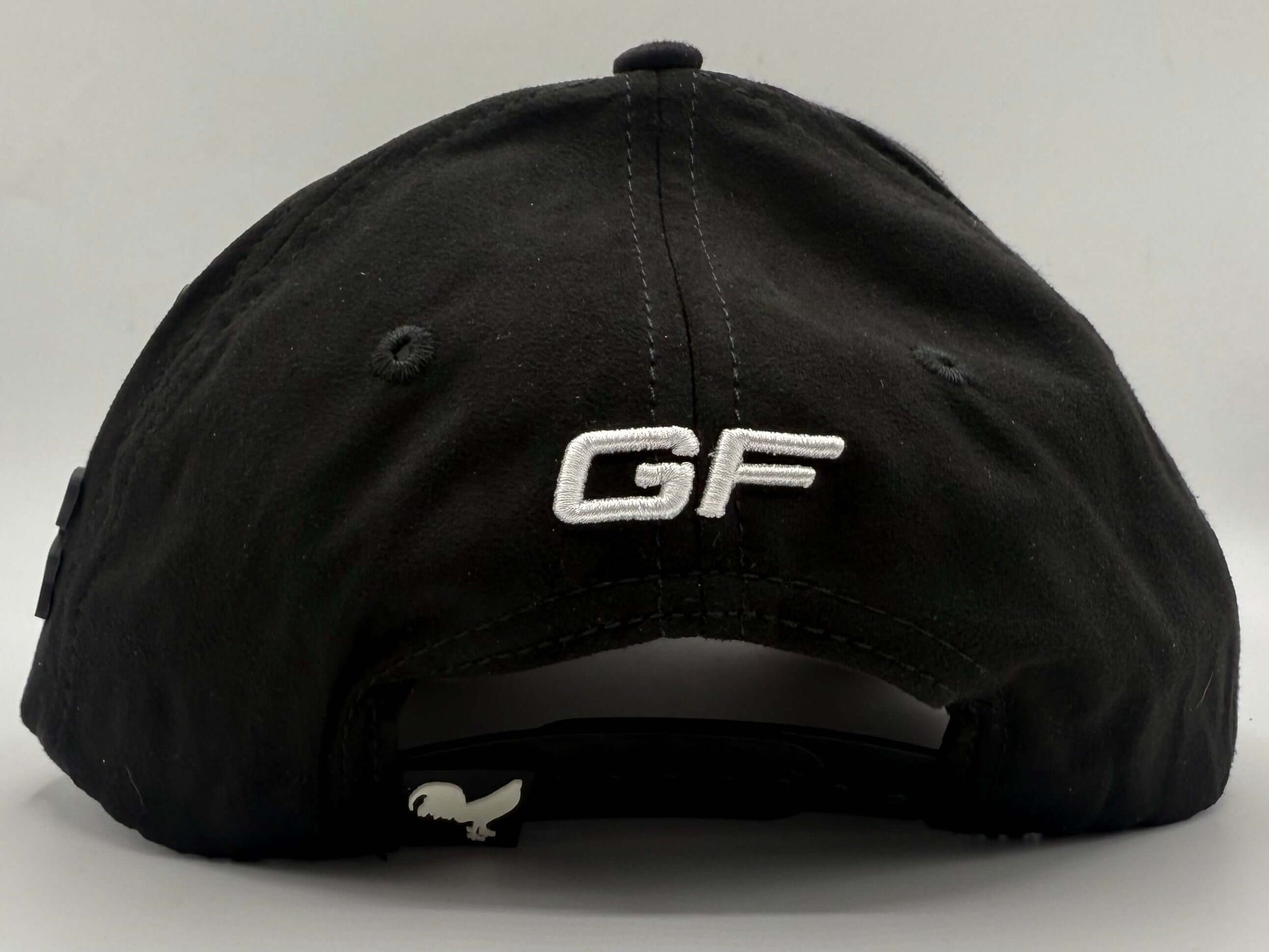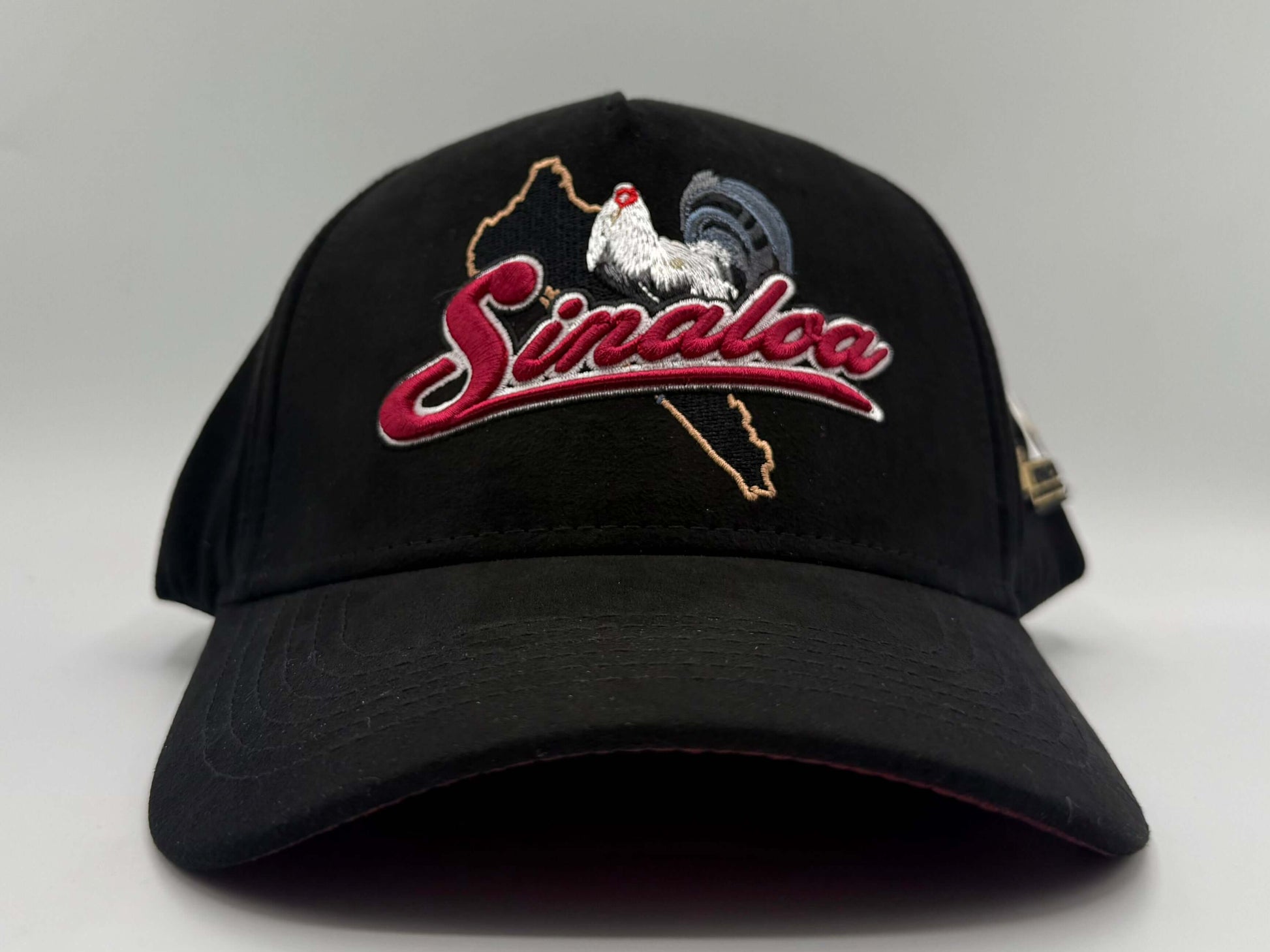 all black suede hat with 3D embroidery “ Sinaloa” with its rooster.GF 3D embroidered rear of hat. Silk liner with Gallo Fino branding