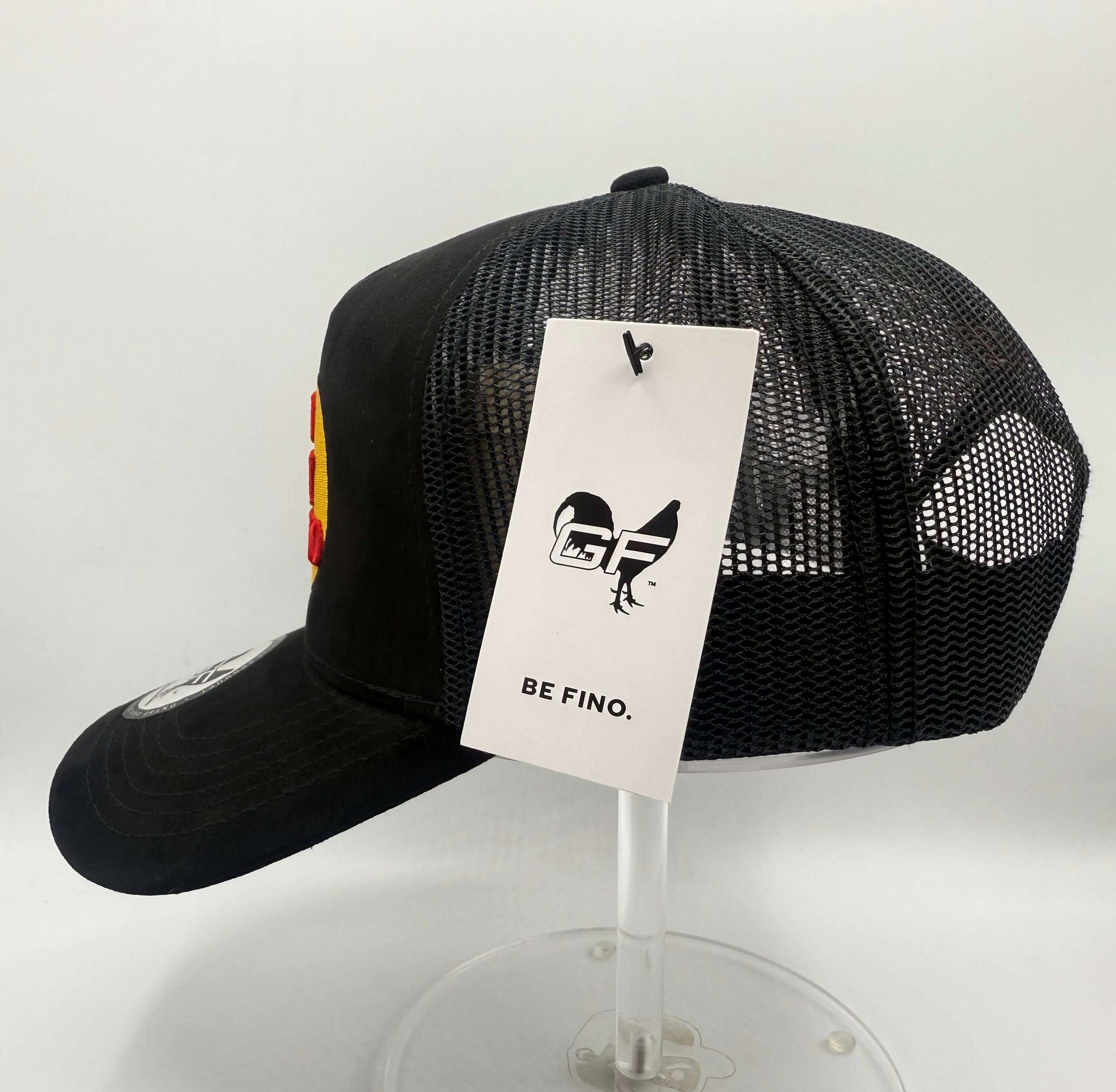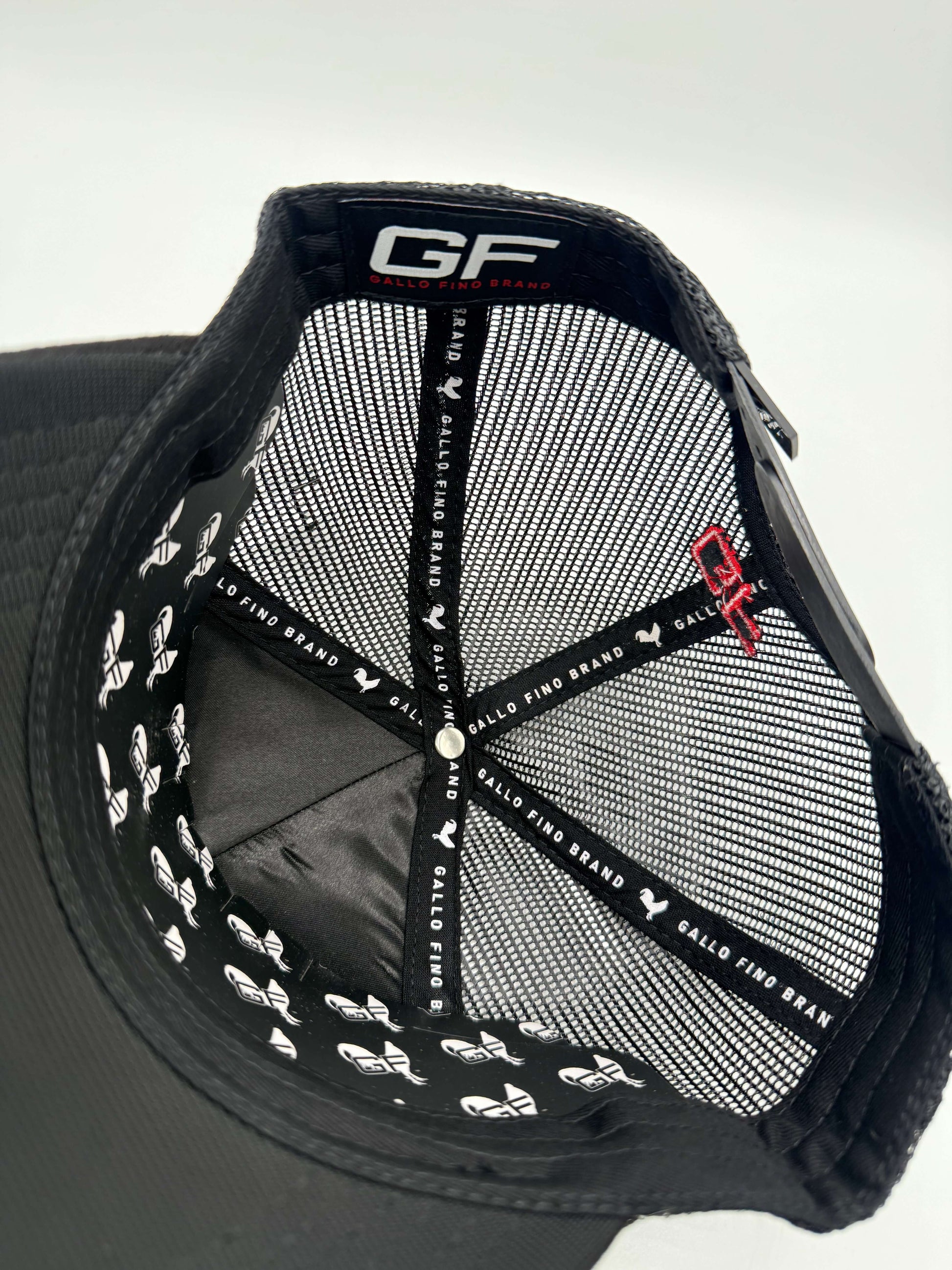 black suede with black mesh. 3-D embroidery and its rooster . With 3-D embroidery of GF in the rear. silk liner with Gallo Fino branding